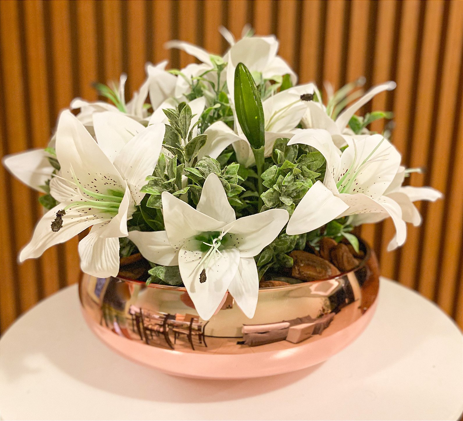 Arranjo Lírios Real Toque montados no Vaso Bacia Rosé