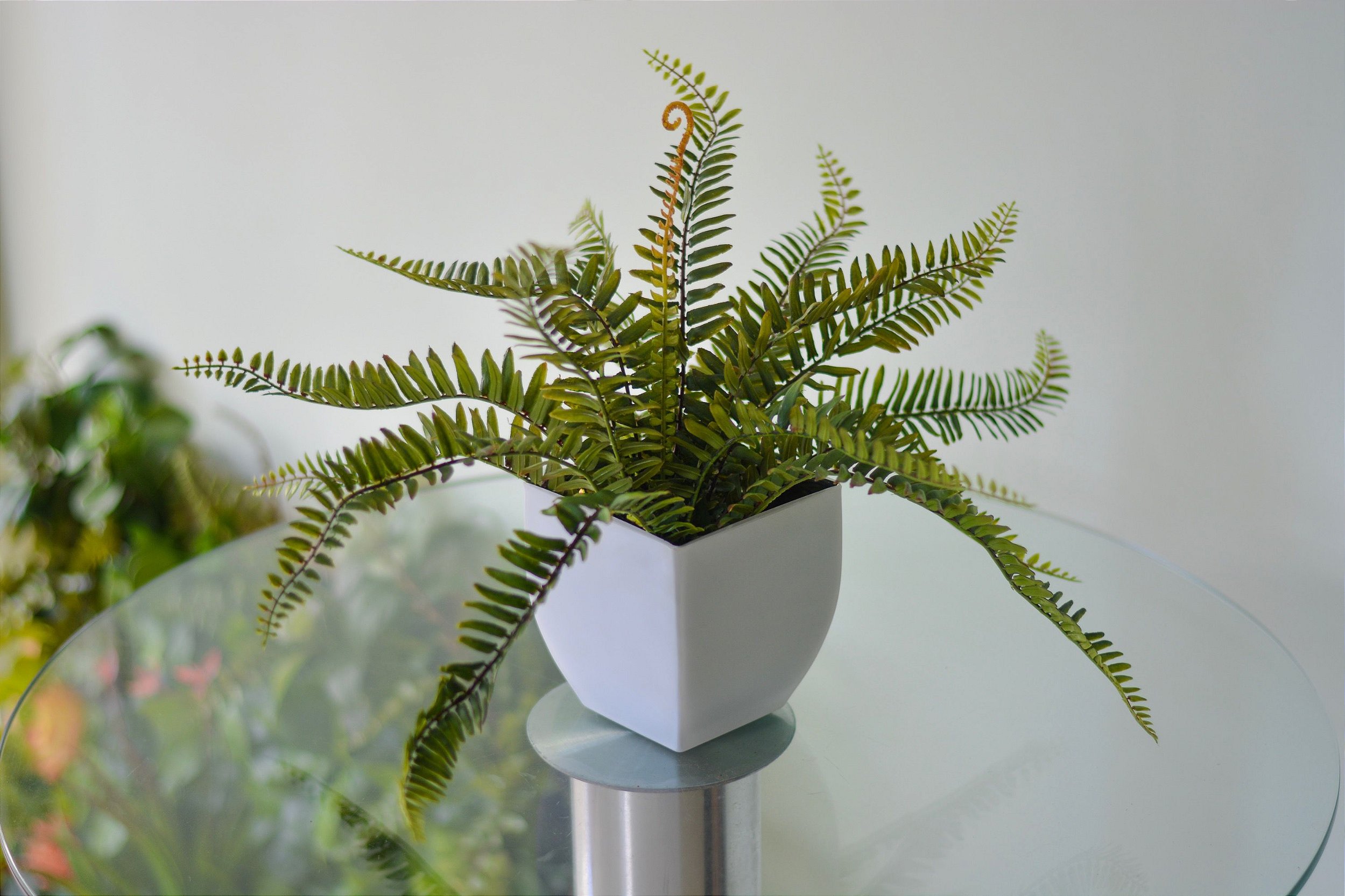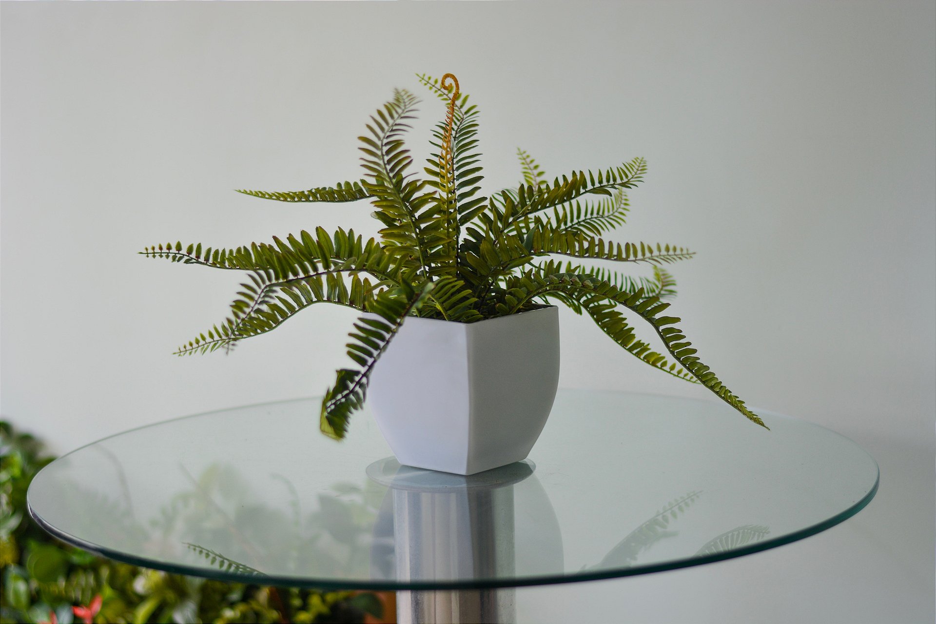 Arranjo Samambaia no Vaso de Vidro Branco de 13cm
