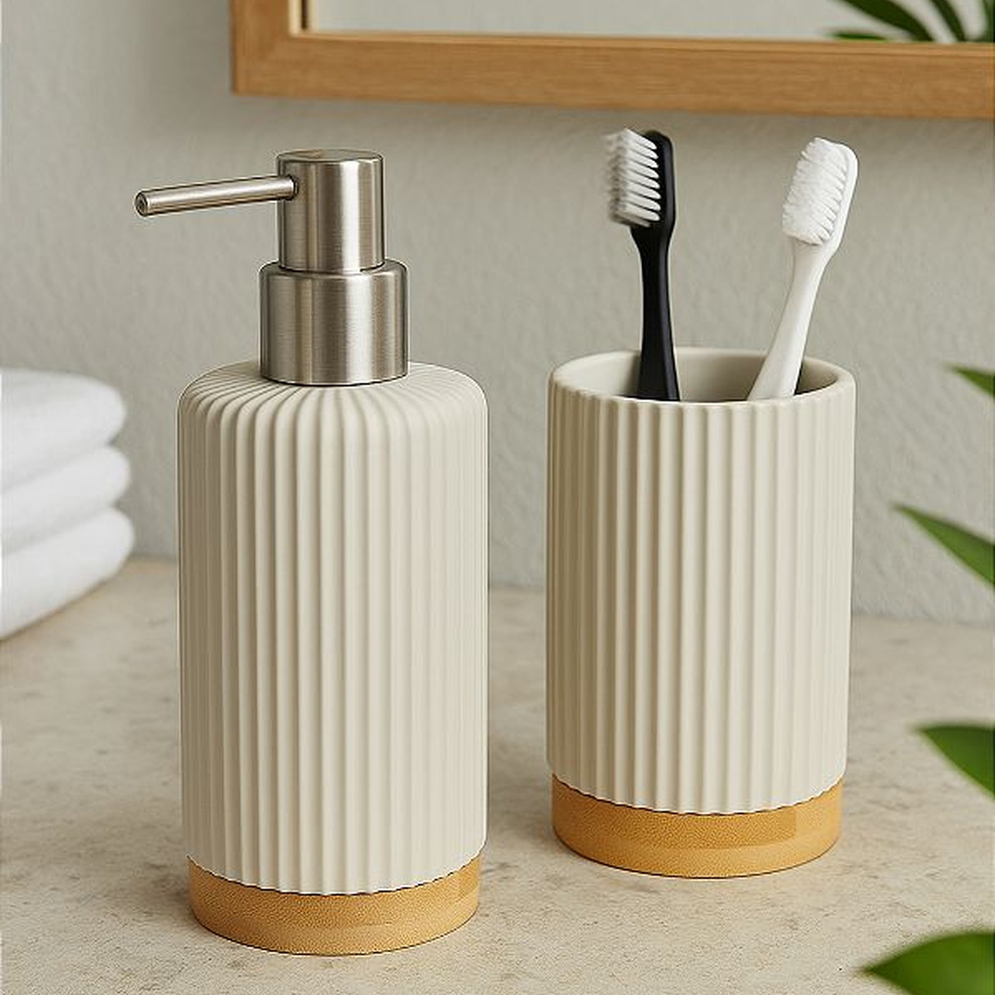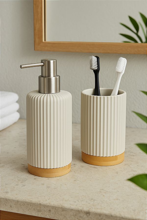Produzido em poliresina de alta qualidade, o kit oferece excelente resistência à umidade e acabamento refinado. Os detalhes em bambu natural acrescentam charme e aconchego, criando uma composição harmoniosa que combina com diferentes estilos de decoração, do moderno ao natural.