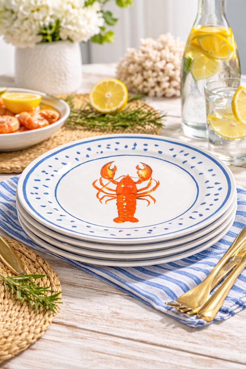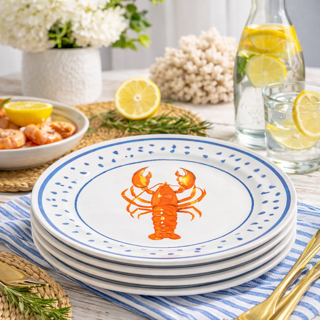 O Prato Raso Melamina 28d Oceano combina charme e praticidade para compor mesas sofisticadas e acolhedoras. Com design inspirado no estilo náutico, traz estampa central de lagosta e delicados detalhes em azul sobre fundo offwhite, perfeito para ambientes de praia, áreas gourmet e mesas decoradas.